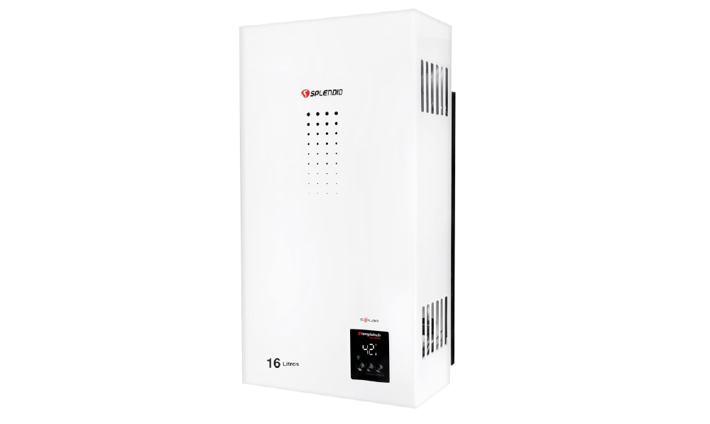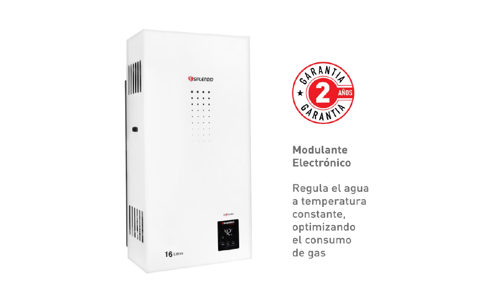 Calefont ionizado Splendid de tiro natural con display digital y encendido automático sin llama piloto. Eficiencia y seguridad con 70 años de respaldo.