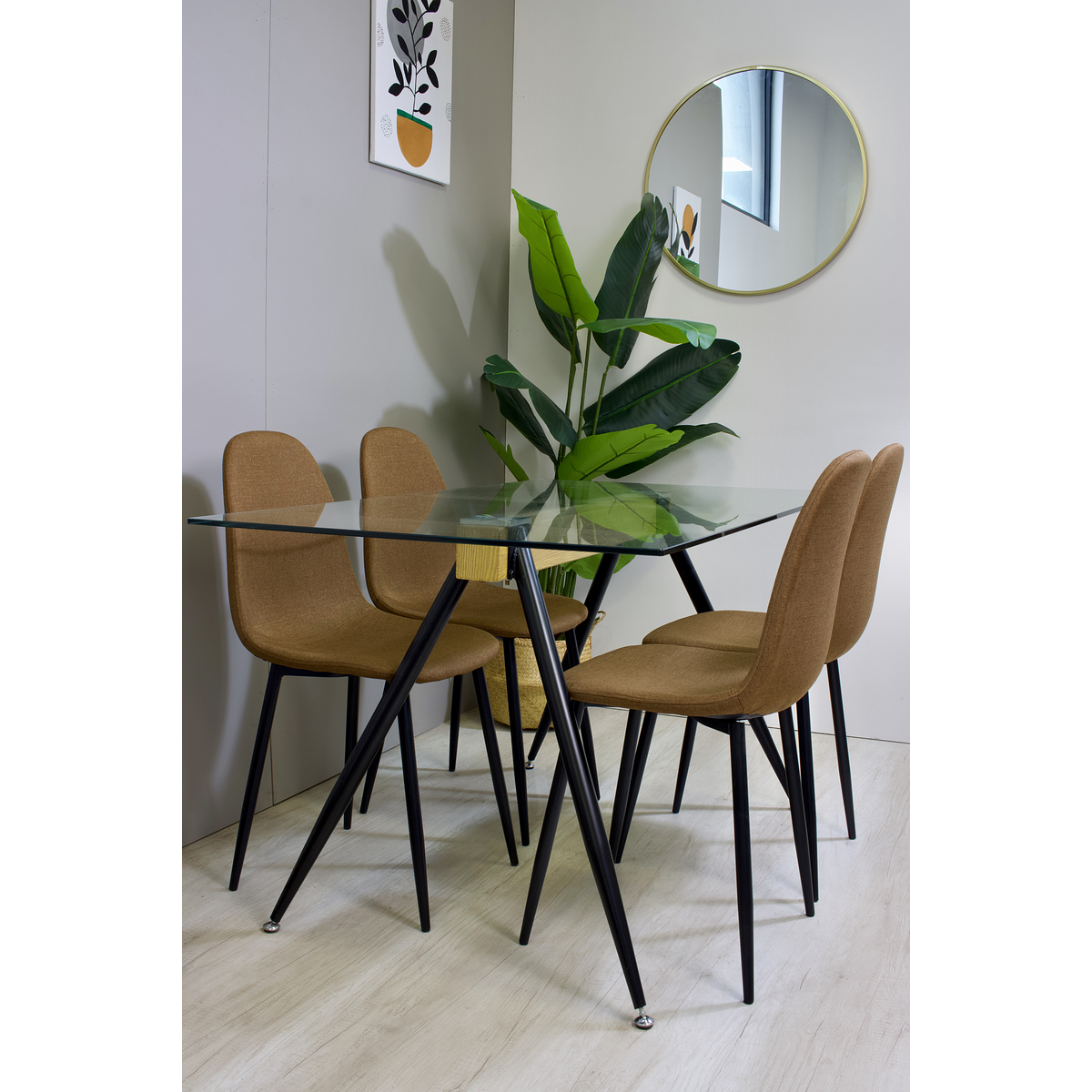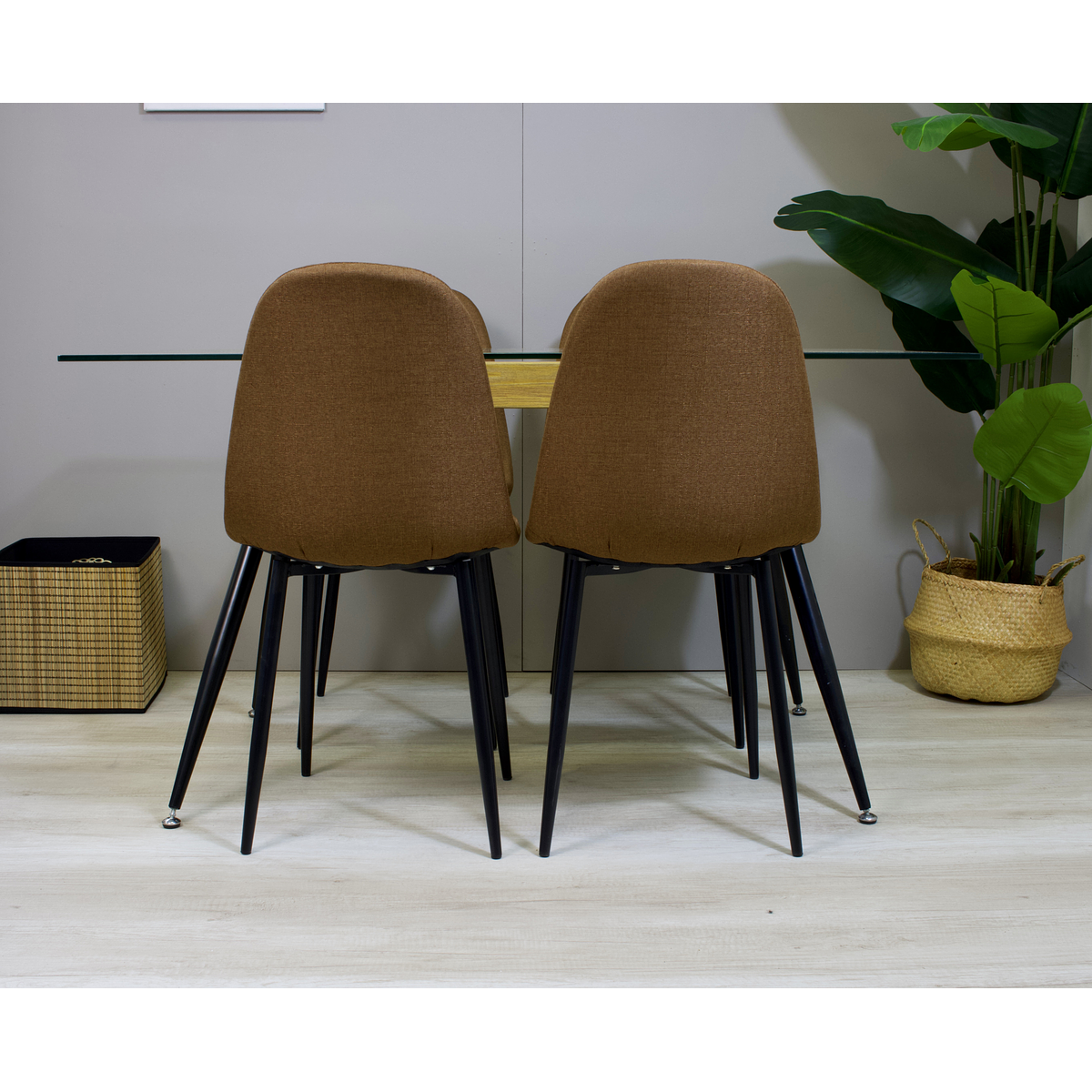 Maravilloso comedor para 4 o 6 puestos con mesa de vidrio templado 10mm de espesor, viga central de fierro con terminación exterior de madera que brindan una resistencia y elegancia increíble, acompañado de 4 sillas de lino café con patas metálicas en negro, del mismo diseño que las patas del comedor, hacen de este una pieza ideal para tu hogar. transmite elegancia, confort y durabilidad. rompiendo el esquema de comedores tradicionales y aportando atemporalidad con el diseño único de las patas de la mesa.Dimensiones y características Sillas:- Alto total 87cm- Ancho asiento 44cm- Profundidad asiento 41cm- Altura del suelo al asiento 47cm- Altura respaldo 42cm- Ancho respaldo 38cmSoporta hasta 160kgs de pesoMaterial patas: FierroSe puede usar en exteriores e interiores, no se decolora.Silla Eames en tapiz de Lino Café, diseñada con patas de metal y acabado en fierro negro mate, cada uno de sus detalles, hacen de esta silla, única, un producto elegante y cómodo con su alto respaldo con forma sinuosa y su acolchado. Se sugiere que sea utilizado para comedores, recibidores, living, incluso como silla para escritorios, salones y oficinas. Su tapiz Textil de textura (Lino) 100% Poliéster, con relleno espuma de alta densidad 25 kg/m3.Tono: Café. Patas metálicas con un acabado en fierro negro mate. Muy fácil armado, solo necesita 4 pernos para afirmar la base al asiento.Dimensiones y Características Mesa:Alto 75 cmAncho 80 cmLargo 140 cmPeso 40kgsGrosor cubierta 10mmConoce más sobre este productoSimple, sofisticada y fácil de armar (Además de económica y duradera) son las principales características que reúne esta espectacular mesa con patas metálicas, base central de madera y cubierta de vidrio templado. Sirve para 4 o 6 puestos, se limpia únicamente con paño húmedo o líquido limpia vidrios. Cubierta de vidrio templado de 6mm de espesor, fácil de limpiar y muy duradera en el tiempo. Diseño simple y minimalista. Sus elegantes terminaciones en las patas delgadas en fierro con acabado en negro mate, sostienen una solidad viga central de madera que el cual le un contraste único entre estos 3 tipos de materiales, esto y mucho mas la destacan sobre el resto y hacen de esta la mesa idea ideal para tu hogar y oficina.Esta mesa funciona perfectamente como escritorio o comedor.Su elegancia y cubierta en vidrio la hacen ideal para combinarla con cualquiera de nuestras sillas.