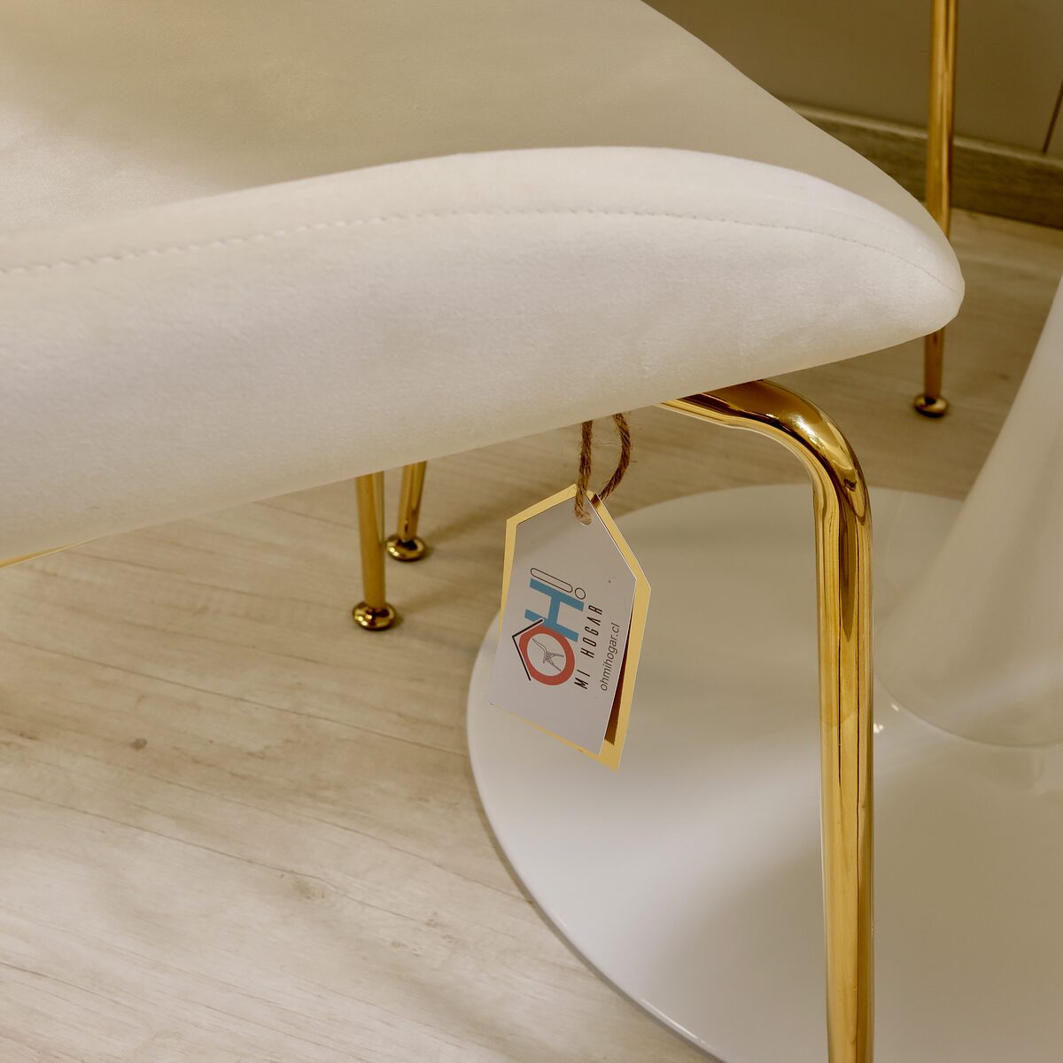 Dimensiones Sillas:- Alto 84cm- Ancho 55cm- Profundidad 43cm- Resiste hasta 180kgs- Material patas: Acero inoxidable- Tapiz: Felpa VelvetDimensiones Mesa:Alto 75 cmDiámetro 100 cmPeso 10 kgsGrosor cubierta 15mm¡Agrega un toque de elegancia y sofisticación a tu hogar con este conjunto de comedor! La mesa Tulip blanca de 100 cm de diámetro, con su diseño simple y minimalista, se destaca por sus elegantes terminaciones en melamina especial y su sólida base en acero inoxidable blanco. Es fácil de armar, económica y duradera. Junto a las sillas Berta, este set de comedor brinda un aire nórdico y retro, con una sensación de calidez y glamour gracias a su tapizado en terciopelo suave al tacto y patas doradas de acero inoxidable de alta calidad. Además, su acolchado ergonómico proporciona una comodidad inigualable. Ideal para reuniones y cenas, su diseño de líneas simples y funcionales permite que se adapte perfectamente a cualquier espacio del hogar. ¡Aprovecha esta oportunidad de combinar la mesa Tulip con las sillas Berta para armar tu set de comedor y darle un toque de calidez, glamour y color a tu hogar!