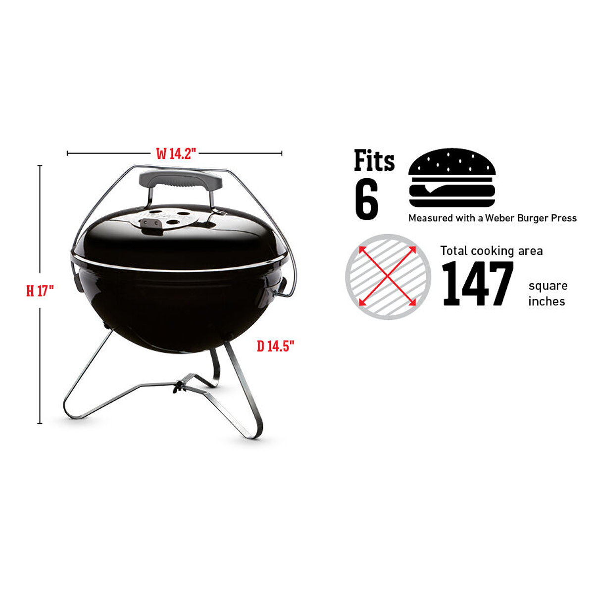 Parrilla a carbón Smokey Joe® Premium, 14″ Color HumoDeja que sea la naturaleza quien prepare el camino mientras el aire fresco te acaricia la cara. Serenidad total: sólo el crujido del carbón interrumpe el silencio. Cuando agarras tu parrilla a carbón portátil Smokey Joe® Premium, las oportunidades de aventura se presentan solas.DIMENSIONES, TAPA CERRADA (CM)43.2CM ALTO X 36.1CM ANCHO X 42CM PROFUNDIDAD DIÁMETRO (CM)37 TIPO DE COMBUSTIBLE CARBÓN AGARRADERAS DE NYLON REFORZADO CON FIBRA DE VIDRIO 1 VENTILAS DE ALUMINIO RESISTENTE AL ÓXIDO 3 CARACTERÍSTICAS PARRILLA DE COCCIÓN DE ACERO RECUBIERTO REJILLA PARA CARBÓN DE ACERO DE GRAN GROSOR TAZÓN Y TAPA ESMALTADOS SEGURO PARA TAPA TUCK-N-CARRY