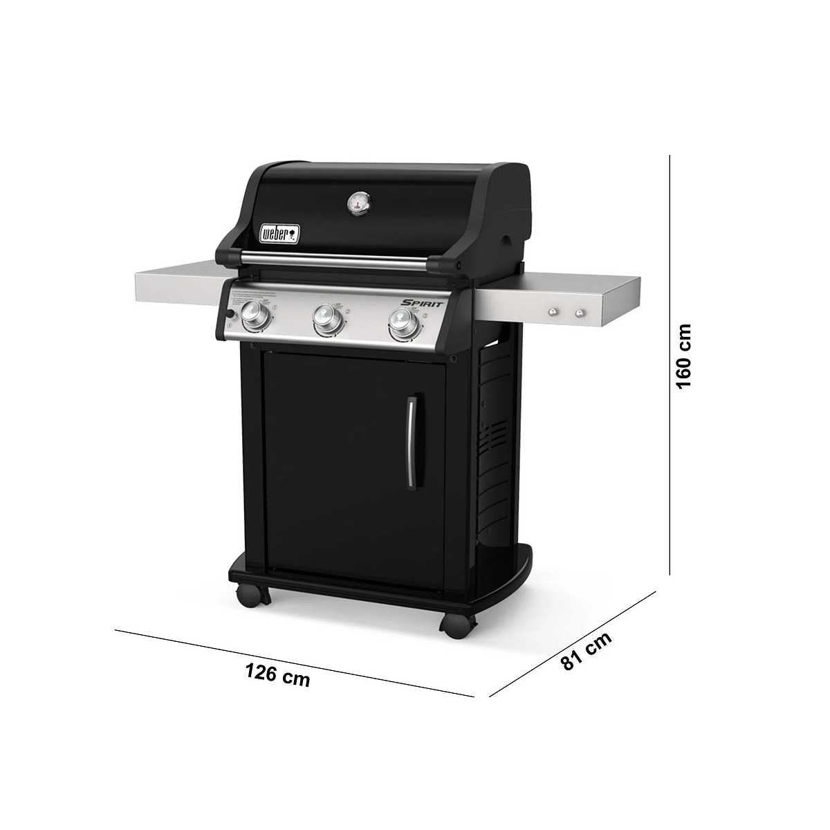 La parrilla a gas de tres quemadores Spirit Black E-315 posee espacio en abundancia para cocinar y cuenta con cómodas mesas laterales en las que puedes colocar tus bandejas para servir. Cuelga tu espátula y tus pinzas en los ganchos portautensilios para tener siempre al alcance de la mano todo lo que necesites.• Rejillas Gourmet BBQ System de gran resistencia y fácil limpieza fabricadas en hierro colado vitrificado.• El acabado vitrificado de Weber contribuye a prevenir la oxidación y el agrietamiento.• Área de cocción principal de 2745 cm².• Soporte para calentar, ideal para mantener los alimentos calientes sin que ocupen espacio en la rejilla principal.• Distribuye uniformemente el calor, evitando la aparición de zonas calientes o frías en las rejillas.Especificaciones de la parrillaCerrarQuemadores principales: kW/h9.38 Dimensiones, tapa abierta (cm)160 cm Alto x 126 cm Ancho x 81 cm Profundidad Dimensiones, tapa cerrada (cm)116 cm Alto x 126 cm Ancho x 61 cm Profundidad Área de cocción principal (cm)2745 cm2 (61 cm x 45 cm) Área del soporte para calentar (cm)672 cm2 Área de cocción total (cm)3417 cm2 Quemadores de acero inoxidable3 Tipo de combustibleGas Licuado GLP (gas licuado de petróleo) Mesas laterales2 Ruedas giratorias2 Ruedas giratorias con freno2 Ganchos portautensilios2