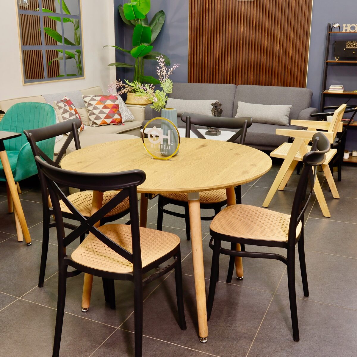 Renueva tu espacio con el elegante y funcional Comedor Extensible + Sillas Crossback Top. Este conjunto combina la versatilidad de una mesa extensible con la sofisticación y comodidad de las sillas Crossback Top, perfectas para cualquier hogar. Con opciones para 4, 6 u 8 sillas, este comedor se adapta a todas tus necesidades, ofreciendo una configuración ideal para cada ocasión.Opciones de Configuración:•Mesa Extensible Wood + 4 Sillas Crossback Top•Mesa Extensible Wood + 6 Sillas Crossback Top•Mesa Extensible Wood + 8 Sillas Crossback TopMesa Extensible Wood•Material: Madera natural comprimida y recubierta con polipropileno simil terminación textura madera (Esto hace que la cubierta sea impermeable, fácil de limpiar, más liviana y duradera) , con patas de acero y madera rígida de haya.•Dimensiones:•Cerrada: 100 cm•Primera extensión: 140 cm•Segunda extensión: 180 cm•Alto: 75 cm•Características:•Diseño moderno y funcional•Extensible, adaptándose a diferentes necesidades de espacio•Estructura robusta y estableDimensiones de la Mesa:Tamaño de CubiertaDimensiones (cm)Cerrada100 x 100cmPrimera Extensión140 x 100cmSegunda Extensión180 x 100cmSillas Crossback Top•Material:•Asiento: Polipropileno microperforado en tono café claro, simulando ratán•Estructura: Polipropileno con patas de acero en color negro•Dimensiones:•Alto total: 89 cm•Ancho asiento: 50 cm•Profundidad asiento: 43 cm•Altura del suelo al asiento: 45 cm•Alto respaldo: 44 cm•Capacidad de carga: Soporta hasta 160 kg•Características:•Diseño ergonómico para mayor comodidad•Ideal para cualquier espacio interior•Resistente y duraderoVentajas del Set:•Estilo y Versatilidad: El diseño moderno y elegante de la mesa extensible combinado con las sillas Crossback Top añade un toque de sofisticación a cualquier comedor.•Funcionalidad: La mesa extensible permite ajustar el tamaño según la ocasión, ya sea una cena íntima o una gran reunión familiar.•Comodidad: Las sillas Crossback Top proporcionan una experiencia de asiento cómoda y lujosa, perfecta para largas sobremesas.Tips y Recomendaciones para el Mantenimiento de la Mesa Extensible:•Limpieza: Utilizar un paño húmedo y jabón neutro para limpiar la superficie. Evitar el uso de productos químicos agresivos.•Protección: Utilizar manteles individuales y posavasos para proteger la madera de posibles manchas y daños por calor.•Extensiones: Asegurarse de abrir y cerrar las extensiones suavemente para evitar daños en el mecanismo.Enlaces de productos individuales:•Sillas Crossback Top•Mesa Extensible WoodNota: Contenido e imágenes protegidos por derechos de autor de marca registrada Oferta ® en Chile ante INAPI.