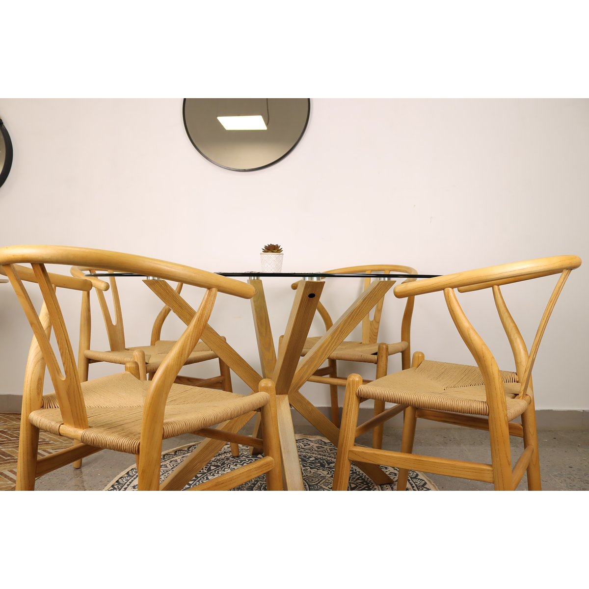 Este Set de Comedor Mesa Redonda + 4 Sillas Wishbone Natural es la opción ideal para quienes buscan un diseño elegante, funcional y de alta calidad. Añade un toque de distinción a tu hogar u oficina con este conjunto, que combina lo mejor del diseño moderno y la comodidad en un solo lugar. ¡Haz de tu comedor un espacio único con este set exclusivo!